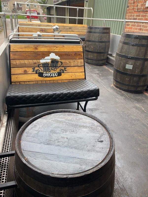 Semi open top deck with original style bus seating & Whiskey barrel tables.